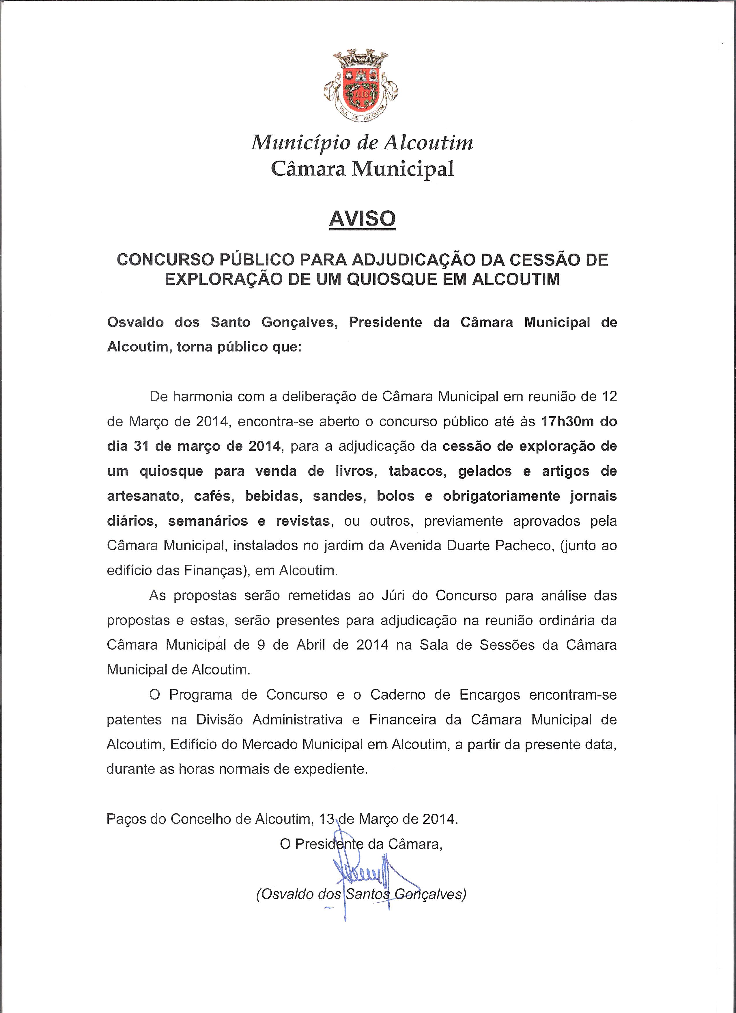 DownloadAviso - Concurso Público para adjudicação da exploração de um Quiosque em Alcoutim
